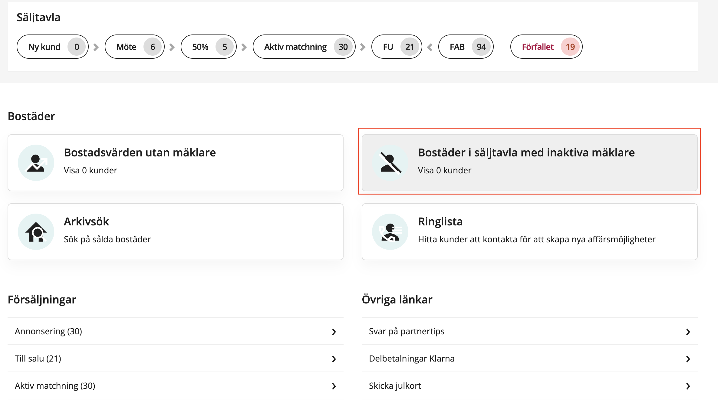 Om bostäder inte flyttas från en säljtavla efter en mäklare har slutat så kommer samtliga bostäder hamna i "bostäder i säljtavla utan ansvariga mäklare" under Översikt i KVS. Där kan man välja att hantera dem ifall detta inte skedde.