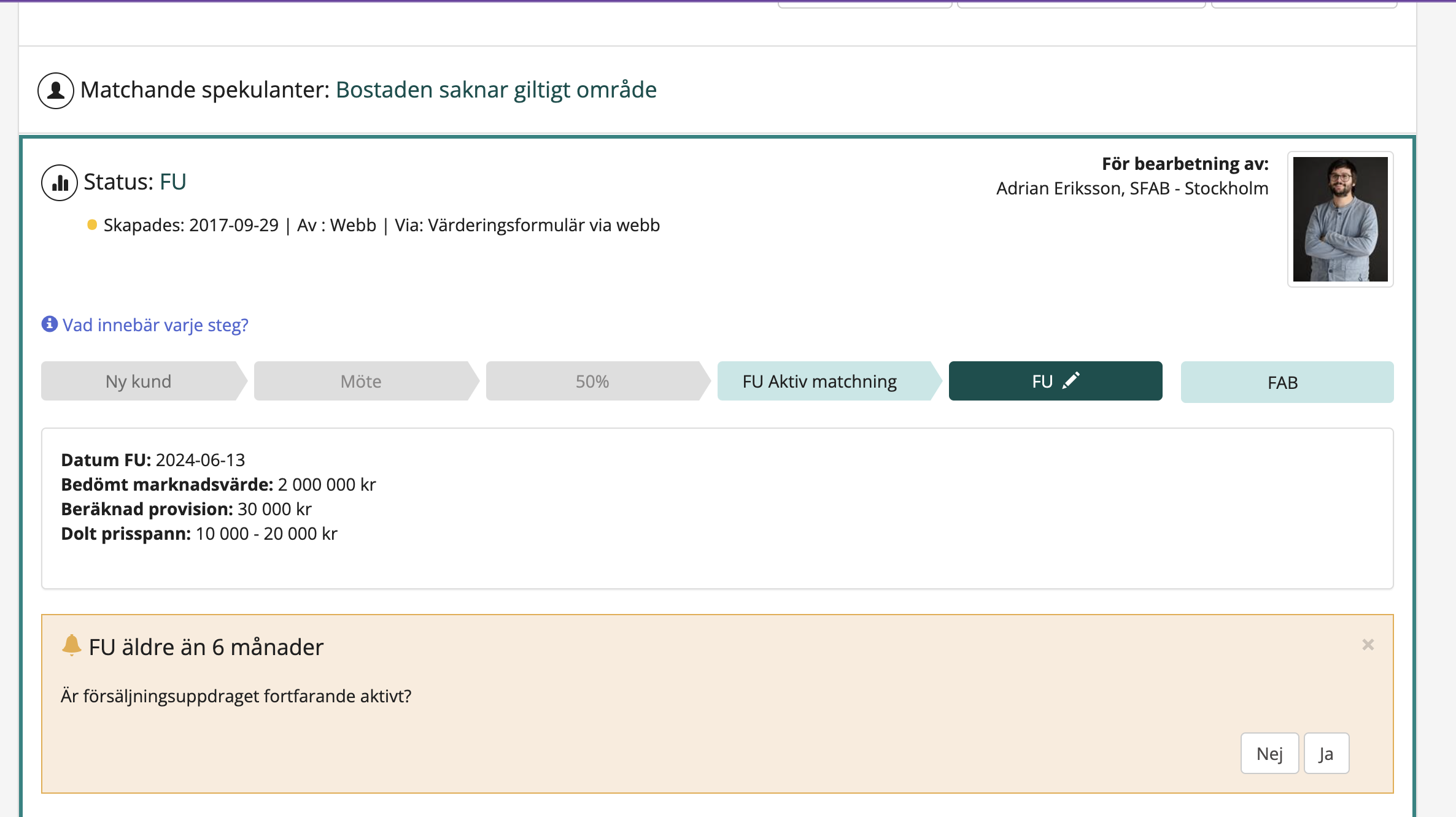 När en person slutat på Svensk Fastighetsförmedling är det viktigt att överlämningen av objekt är korrekt hanterade. Om ansvarig mäklare inte bytts så kan vi förlora en kundkontakt, samt kopplingar till IF och vilken mäklare på hemsidan som syns.