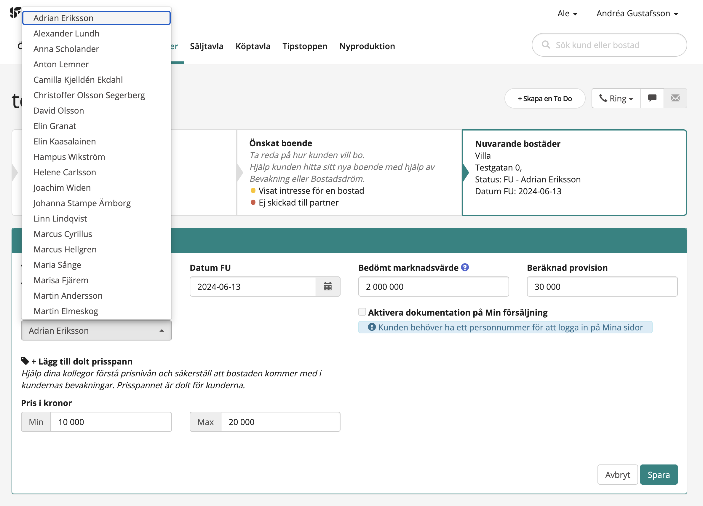 2. Välj därefter ansvarig mäklare, efter det kommer bostaden byta säljtavla