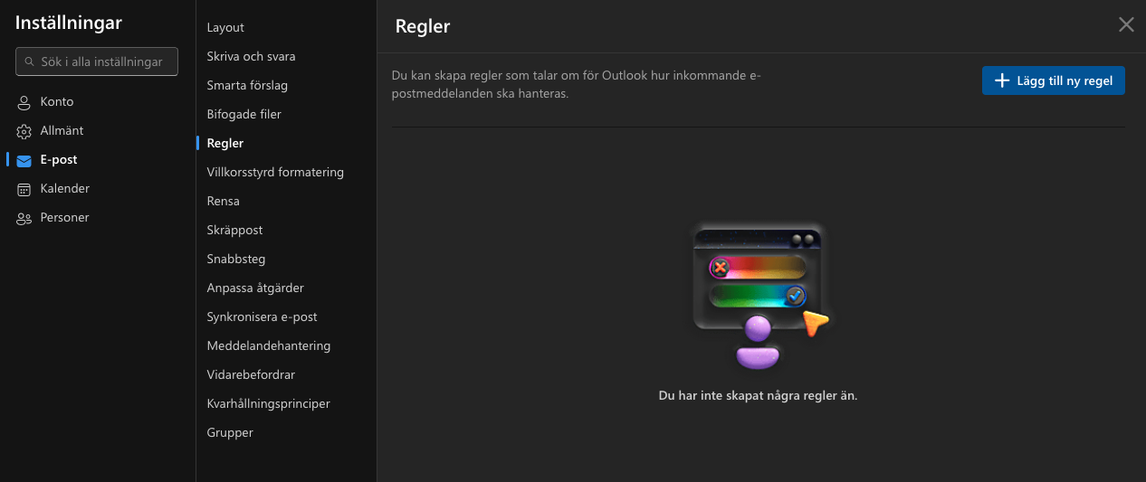 Om du ej får inkommande mail, kolla om det finns en regel uppsatt som påverkar inskicken av epost. Gå då in i dina inställningar, gå till epost och sedan regler. Om du hittar en regel du inte har skapat, ta bort den då.