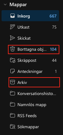 Om du saknar mail i din postlåda, kolla kolla i andra mappar som Arkiv eller Borttaget om de mailen finns där. Återställ dessa meddelanden genom att shift+klicka på samtliga mail du vill återställa och dra in dem i inkorgen.